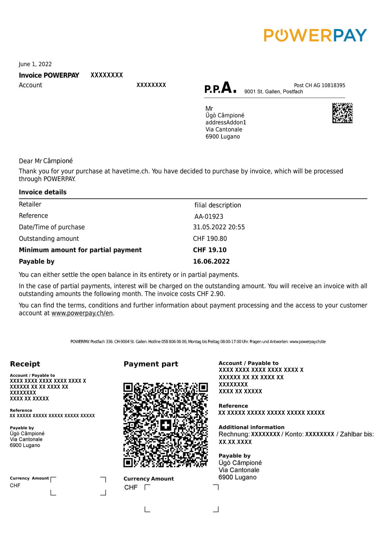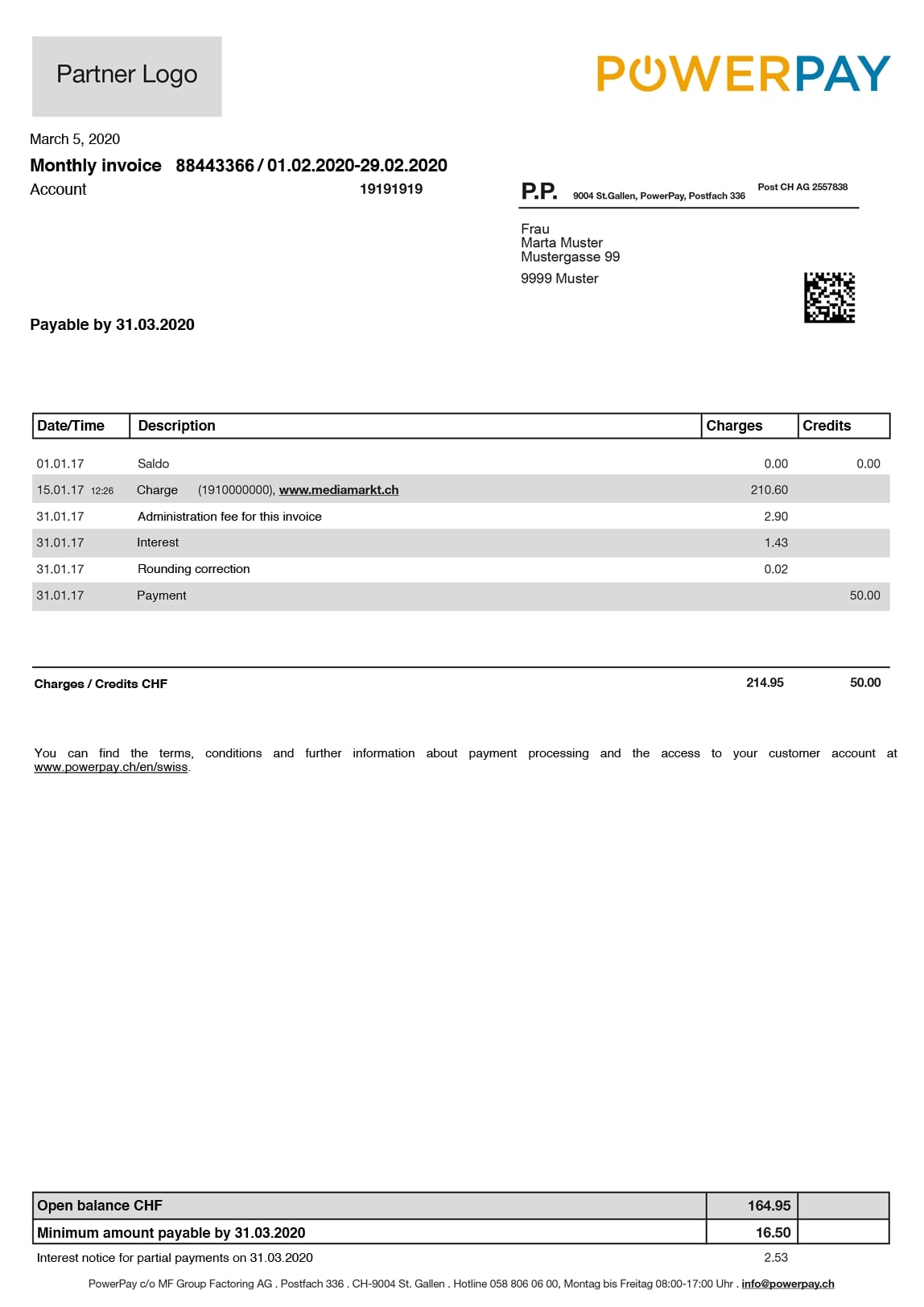 Invoice and account numberYour invoice and account number. Please always provide these numbers in case of inquiries via phone or mail.Your addressPlease notify us of address changes to prevent additional costs.POWERPAY merchantThis Indicates at which POWERPAY merchant you made purchases online, in a store or by using your mobile phone as well as the order reference number.Total amountThe total invoice amount due. You may use the payment slip below, should you prefer to pay this total invoice amount entirely (please indicate the respective total amount).Minimum amountIf you choose the option to pay in instalments, the minimum amount due is shown here.Payment deadlinePlease ensure to pay the total invoice amount or the instalment before this date.Partial paymentIf you choose the option to pay in instalments, your remaining balance will be transferred to your next monthly invoice and a (12%) yearly interest on the overall balance will be charged.